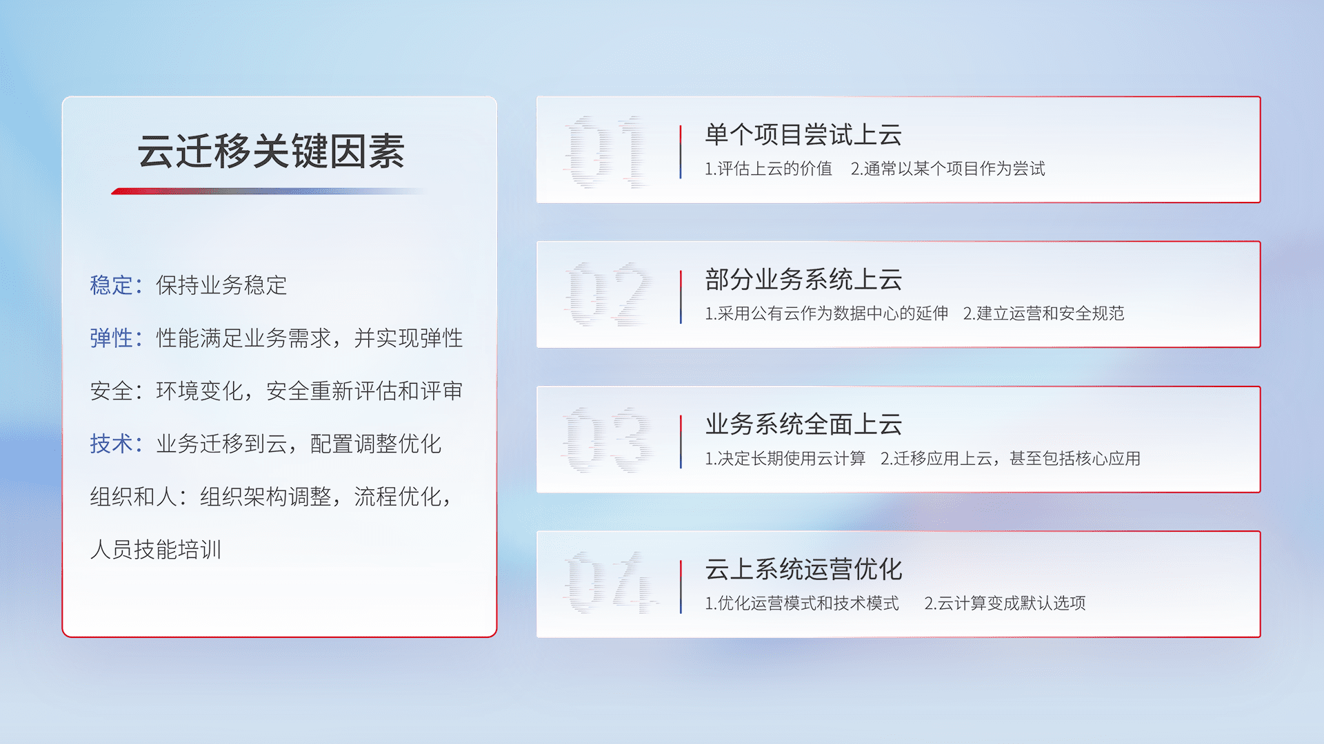结合实际业务,,从规划设计、、云平台选型、、、云原生改造、、数据迁移、、、、集成交付,,,,迁移全过程为客户识别最佳上云路径,,做好风险识别管理,,,,设计网络架构、、、、身份权限、、安全审计合规、、、、操作审计、、、、日志审计、、、监控告警策略、、多站点容灾设计等,,,对云上基础设施进行整体规划,,,,提升IT治理水平,,,以满足弹性、、、、高可用、、、高性能的需求。。。。